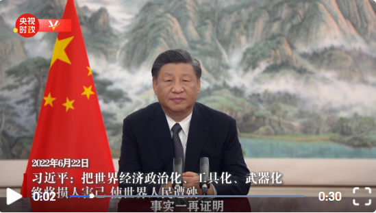 習近平說:“事實一再證明,制裁是‘回旋鏢’、‘雙刃劍’,把世界經濟政治化、工具化、武器化,利用國際金融貨幣體系的主導地位肆意制裁,終將損人害己,使世界人民遭殃。”