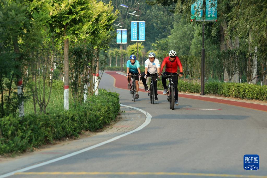 6月17日,市民在河北省滄州市大運河畔堤頂路騎行。新華社記者 駱學峰 攝