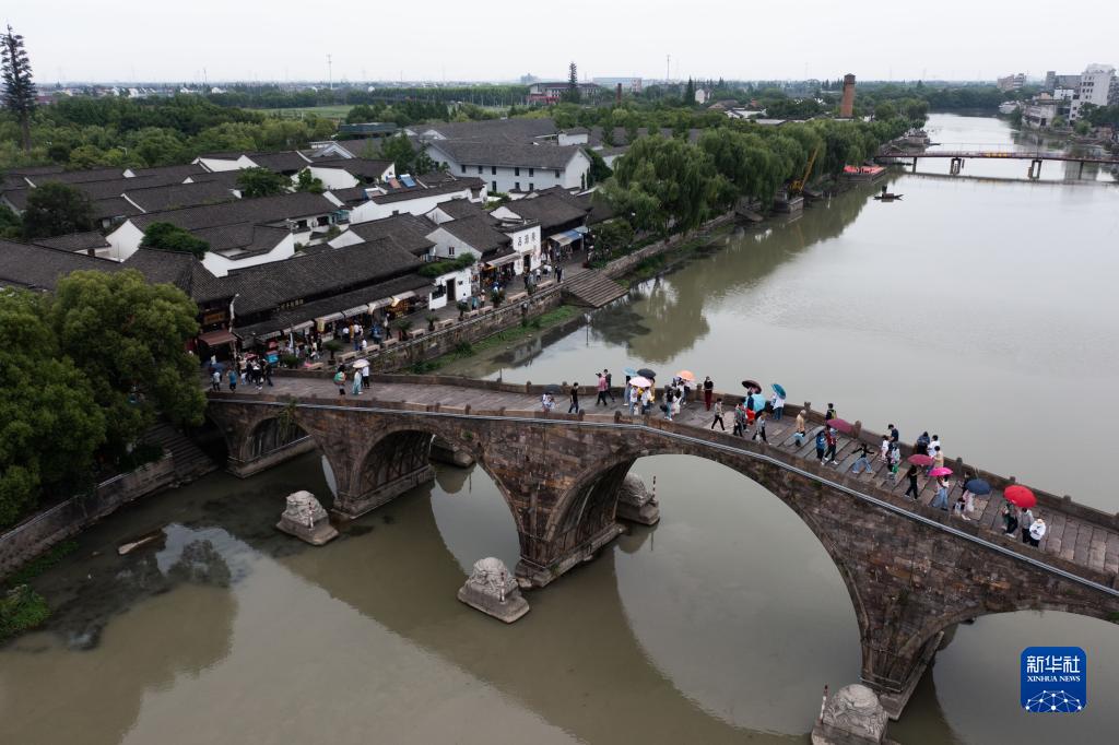 這是5月28日拍攝的經(jīng)過浙江杭州塘棲古鎮(zhèn)的京杭大運河(無人機照片)。新華社記者 徐昱 攝