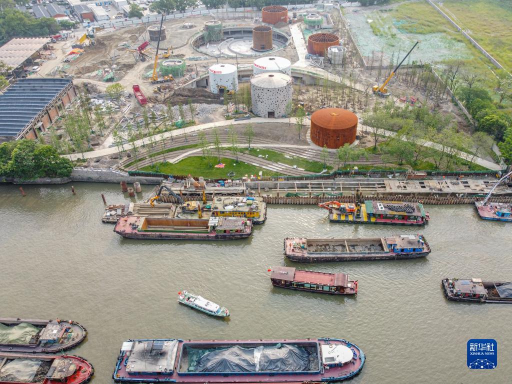 這是5月27日在浙江省杭州市拍攝的建設中的小河公園,該公園由一處工業(yè)遺存小河油庫改造而成(無人機照片)。新華社記者 江漢 攝