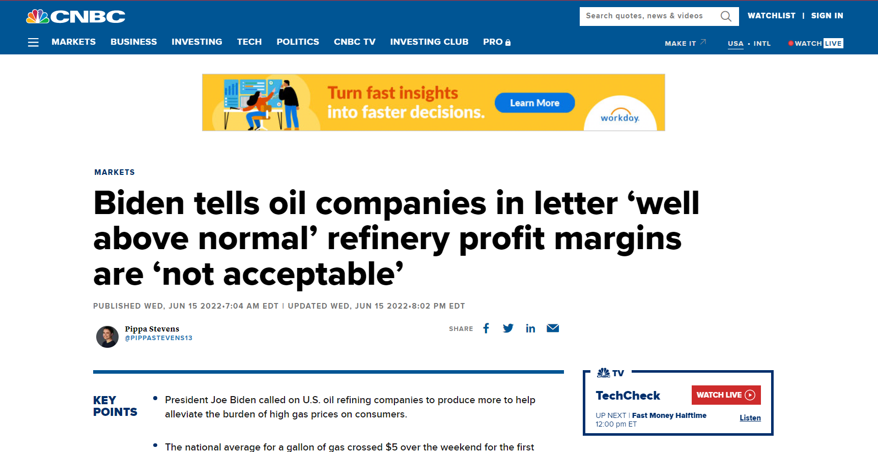 美國(guó)總統(tǒng)拜登此前已多次抨擊石油公司從燃料供應(yīng)緊張的局面中攫取了巨額利潤(rùn)。他在上周發(fā)給美國(guó)七家主要煉油企業(yè)的信中寫道:“在戰(zhàn)爭(zhēng)時(shí)期,煉油廠的利潤(rùn)率遠(yuǎn)遠(yuǎn)高于正常水平,而企業(yè)將代價(jià)直接轉(zhuǎn)嫁給美國(guó)人民,這是不可接受的。”
