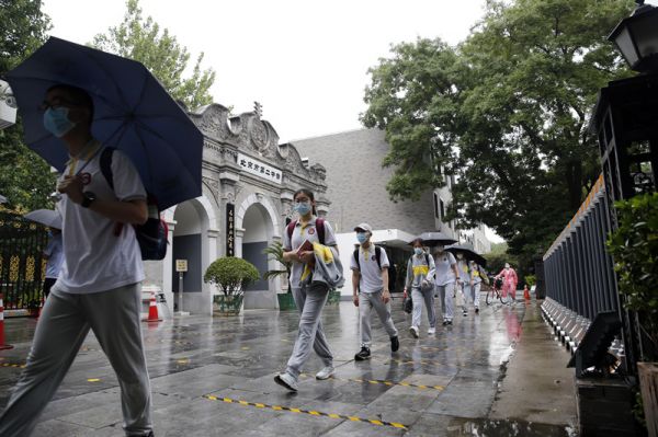 6月27日,北京二中學生在出示健康碼、接受體溫檢測后按照指定通道進入校園。(新華社發)