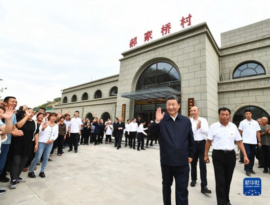 2021年9月13日至14日,中共中央總書記、國家主席、中央軍委主席習近平在陜西省榆林市考察。這是14日下午,習近平在綏德縣張家砭鎮郝家橋村考察時,向鄉親們揮手致意。新華社記者 謝環馳攝