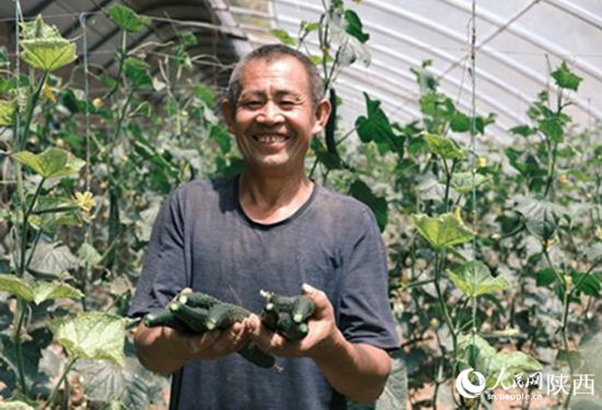 在自家大棚里,高玉奇拿著剛采摘的黃瓜笑得合不攏嘴。人民網 吳超攝