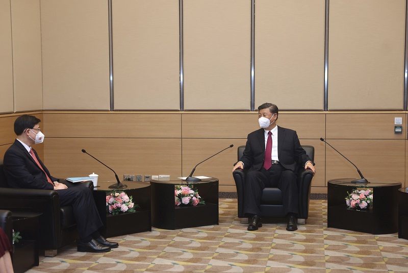 7月1日上午,國家主席習近平在香港會見剛剛就職的香港特別行政區行政長官李家超。新華社記者 鞠鵬 攝