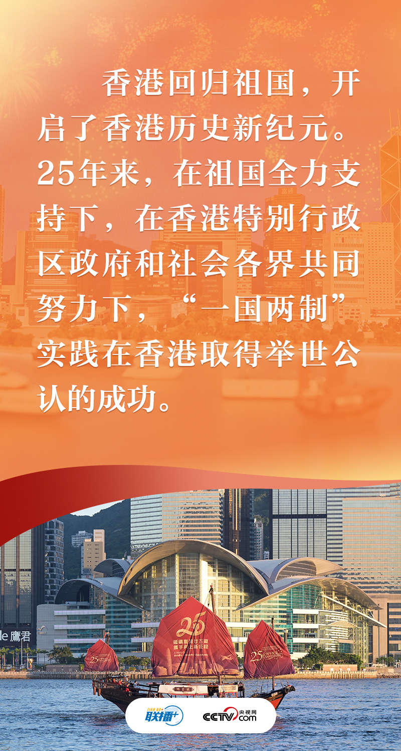 7月1日,習(xí)近平主席在慶祝香港回歸祖國25周年大會暨香港特別行政區(qū)第六屆政府就職典禮上發(fā)表重要講話,深情回顧香港同胞同祖國風(fēng)雨同舟、血脈相連的奮斗史,高度評價(jià)“一國兩制”實(shí)踐在香港取得的舉世公認(rèn)的成功經(jīng)驗(yàn),并對新一屆特別行政區(qū)政府提出殷切厚望。