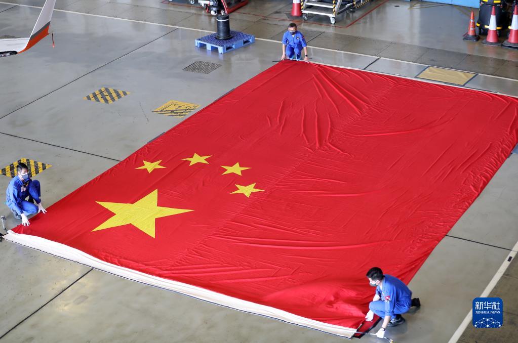 直升機(jī)務(wù)教官蔡澤民套上鞋套,戴上白手套,拿著夾有《國(guó)旗及國(guó)徽條例》的文件夾,一一對(duì)照檢查。國(guó)旗是在具備資質(zhì)的廠家專門定制的,規(guī)格規(guī)范都有嚴(yán)格要求。國(guó)旗大,就有拼接。蔡澤民主要查看色澤是否飽滿和均勻,接縫是否平整,四條邊上有沒(méi)有線頭等,特別要注意的是,五顆星星處不可有接縫。一番操作下來(lái),后背已然濕透。