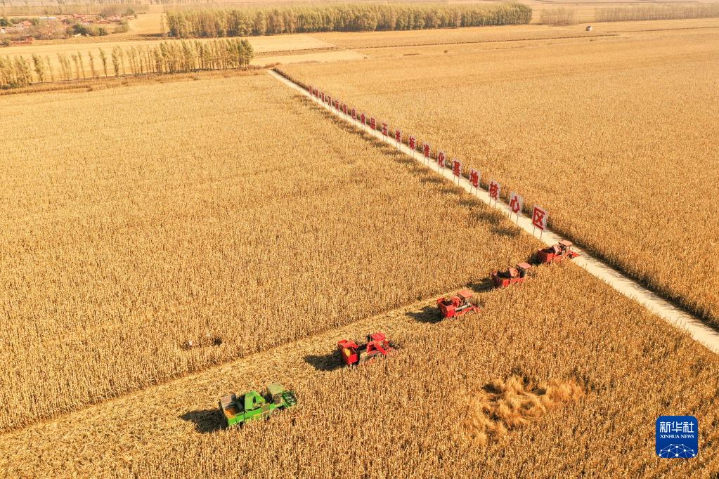 在吉林省梨樹(shù)縣國(guó)家百萬(wàn)畝綠色食品原料(玉米)標(biāo)準(zhǔn)化生產(chǎn)基地核心示范區(qū),農(nóng)民駕駛農(nóng)機(jī)進(jìn)行秋收作業(yè)(無(wú)人機(jī)照片,2021年10月23日攝)。新華社記者 張楠 攝