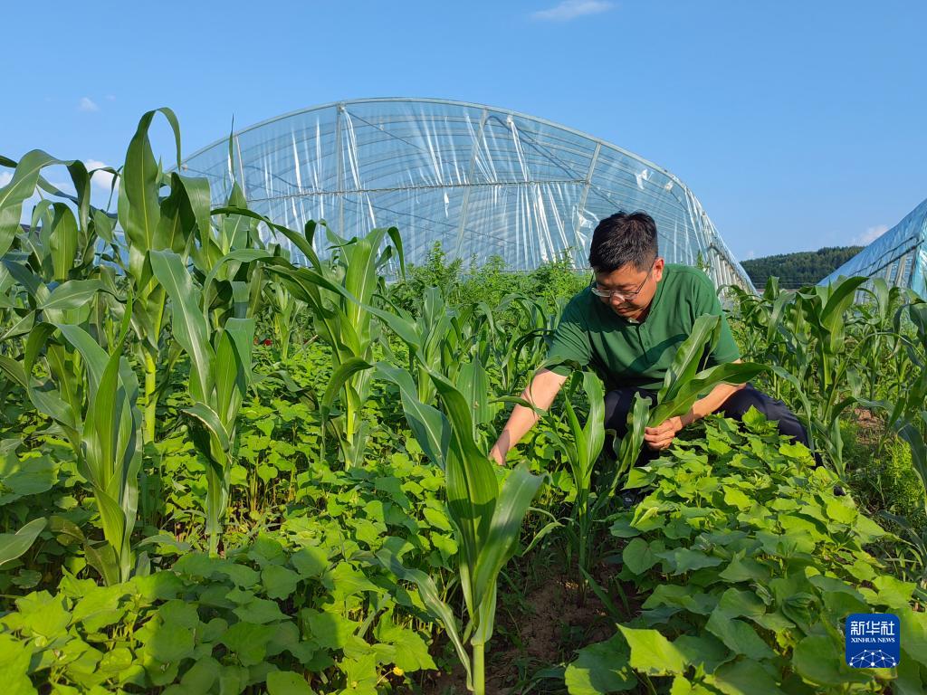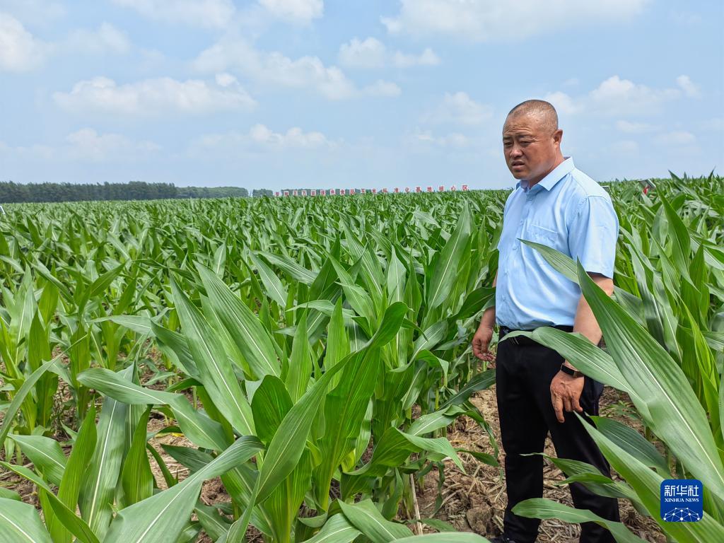 在吉林省梨樹(shù)縣泉眼溝村,宏旺農(nóng)機(jī)農(nóng)民專業(yè)合作社理事長(zhǎng)張文鏑在田里查看不同種植方式的作物長(zhǎng)勢(shì)(2022年7月5日攝)。新華社記者 薛欽峰 攝
