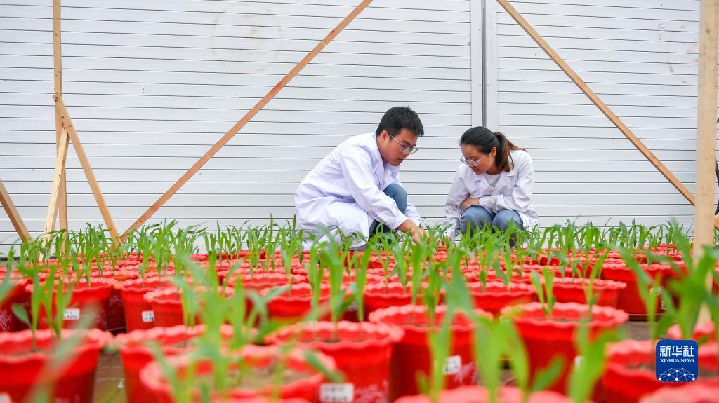 在吉林省梨樹(shù)縣四棵樹(shù)鄉(xiāng)三棵樹(shù)村“科技小院”,中國(guó)農(nóng)業(yè)大學(xué)學(xué)生沙野(左)和郭雯清觀察玉米樣本(2021年8月2日攝)。新華社記者 張楠 攝