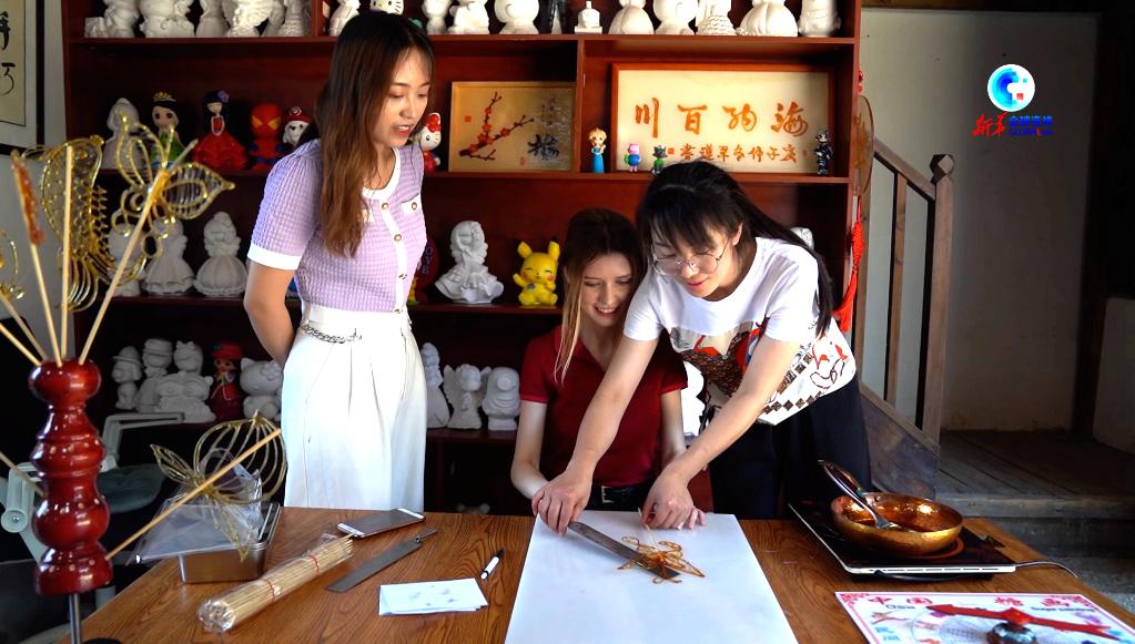 在店里,新華社記者與安吉麗娜現場學習糖畫制作,繪制十二生肖等各種圖案,感受中國民間非遺的魅力。