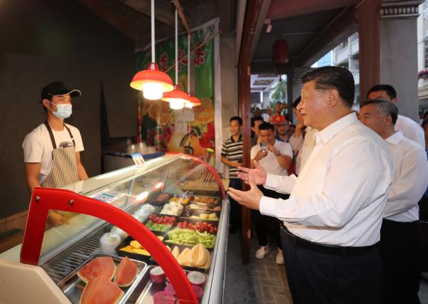 ↑2020年10月12日至13日,習近平在廣東考察。這是13日下午,習近平在汕頭市小公園開埠區,同商鋪店員親切交流,了解復商復市和常態化疫情防控情況。