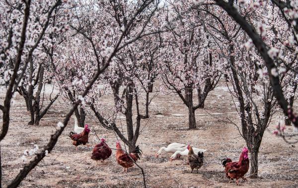 ↑一群雞鵝在陜西省榆林市榆陽區古塔鎮趙家茆村的杏樹林里覓食(2020年4月7日攝)。當地群眾在發展杏產業的同時發展林下經濟,成效顯著。