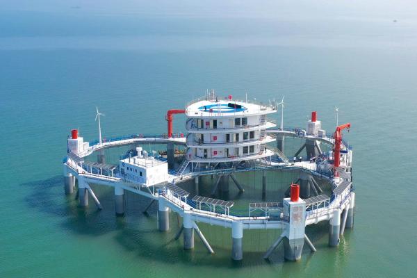 ↑“耕海1號”海洋牧場綜合體平臺位于山東省煙臺市漁人碼頭以東海域,是我國首座大型智能化海洋牧場綜合體平臺,于2020年7月投運,每年可養殖優質海水魚類20萬尾,年產量約15萬公斤(2020年7月10日攝)。