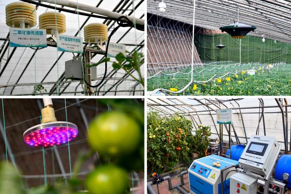↑這是在山東省壽光市現代農業高新技術試驗示范基地拍攝的ai智慧大棚內景。左上為傳感器設備;右上為多功能植保機;左下為補光燈;右下為電動噴淋機(2020年4月21日攝)。