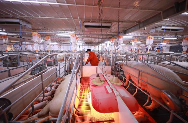 ↑在貴州省銅仁市玉屏侗族自治縣朱家場鎮一家仔豬繁殖場,管理員在清掃豬舍(2018年3月23日攝)。