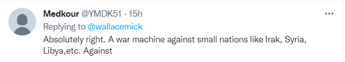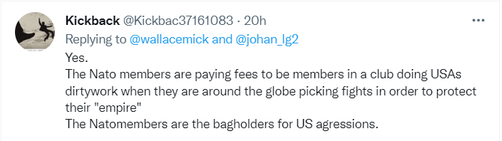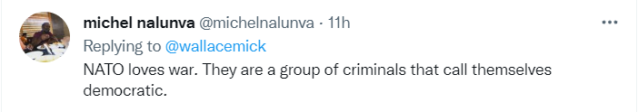 10日,華萊士以同樣的視頻配上不同的文字發了兩條推文,配文是他在視頻中講話的節選!氨奔s不是一個防御聯盟,而是一臺戰爭機器,”華萊士說,“去問問阿富汗、伊拉克和利比亞人民就知道了。北約的真正目的是捍衛正在衰落的美國霸權以及一個單極世界體系,北約為此而存在。”