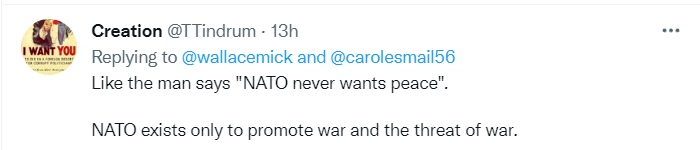 “就像這位男士所說,‘北約從未想要和平’。北約之所以存在,只是為了推動戰爭和發出戰爭威脅!