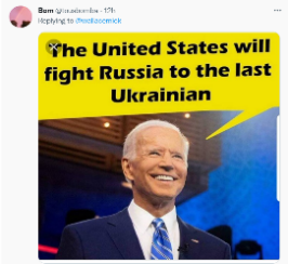 另有網友發了一張圖,上面有美國總統拜登的形象,配文是“美國將與俄羅斯戰斗到只剩最后一個烏克蘭人”!
