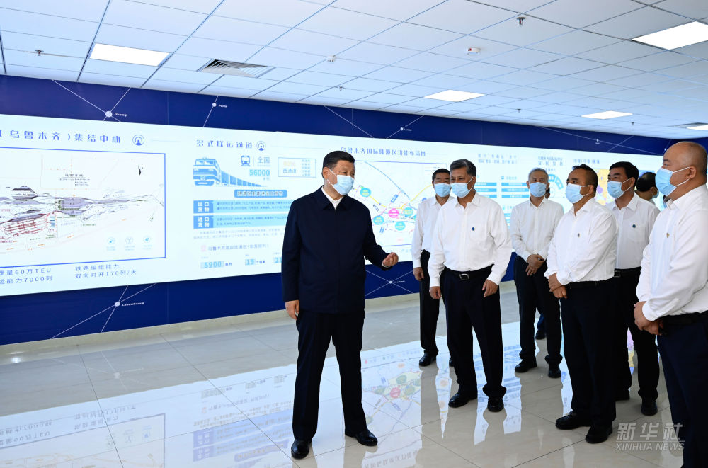 習(xí)近平總書記12日下午來到烏魯木齊國際陸港區(qū),聽取整體情況介紹,通過實時畫面察看中歐班列(烏魯木齊)集結(jié)中心各功能區(qū)和阿拉山口口岸、霍爾果斯口岸現(xiàn)場作業(yè)情況,并同工作人員及現(xiàn)場辦事人員親切交流。