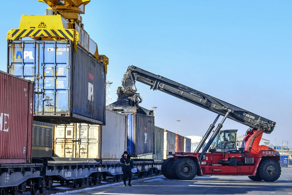 工人在中歐班列(烏魯木齊)集結(jié)中心吊運貨物。