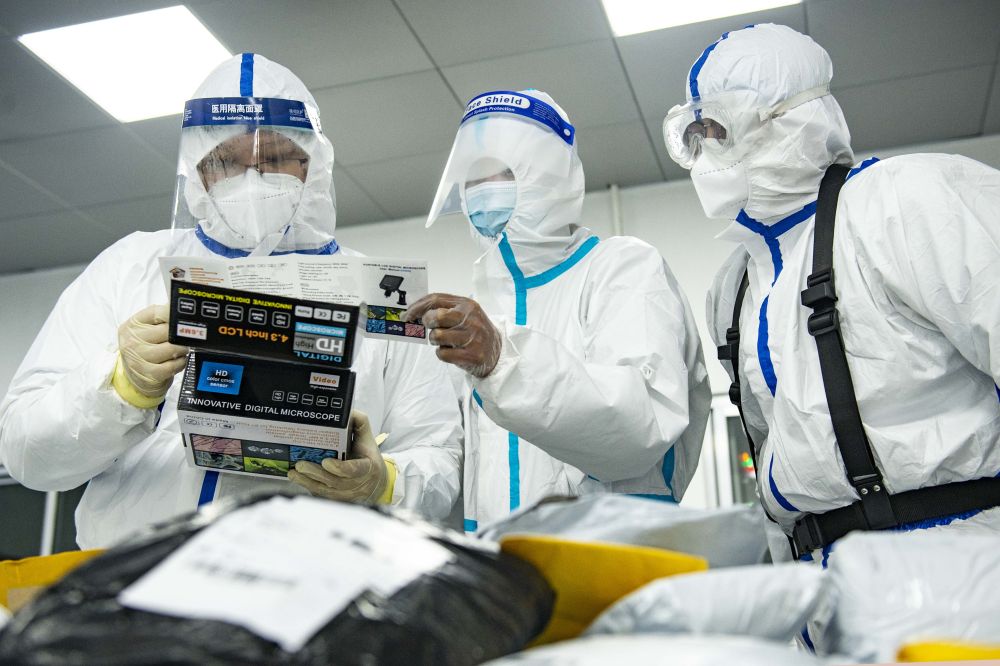2021年2月6日,新疆阿拉山口海關(guān)工作人員在抽檢中歐班列貨品。新冠肺炎疫情發(fā)生以來,中歐班列承接空運、海運轉(zhuǎn)移貨源,實現(xiàn)逆勢增長。