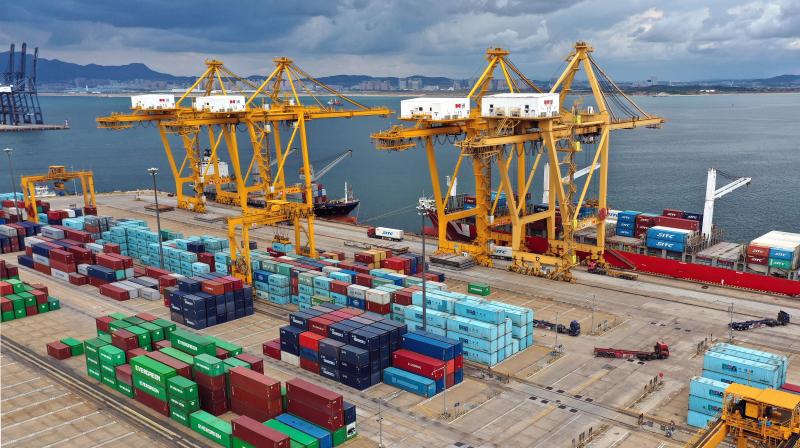在遼寧省大連市遼寧港口集團大連港集裝箱碼頭,貨輪在裝卸集裝箱(2020年9月24日攝,無人機照片)。