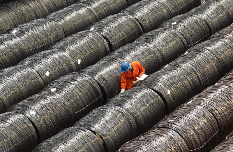 在遼寧省大連市東北特鋼集團車間內,工作人員在核對產品(2017年5月15日攝)。
