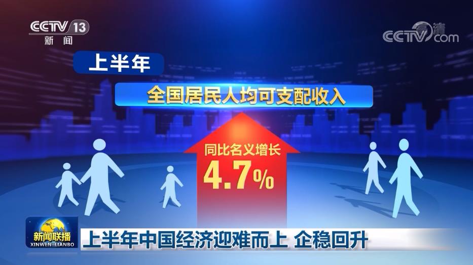 從民生指標看,物價總體平穩,就業形勢好轉,居民收入穩定增長。上半年,全國城鎮新增就業654萬人,完成年度目標任務的59%。全國居民人均可支配收入同比名義增長4.7%。
