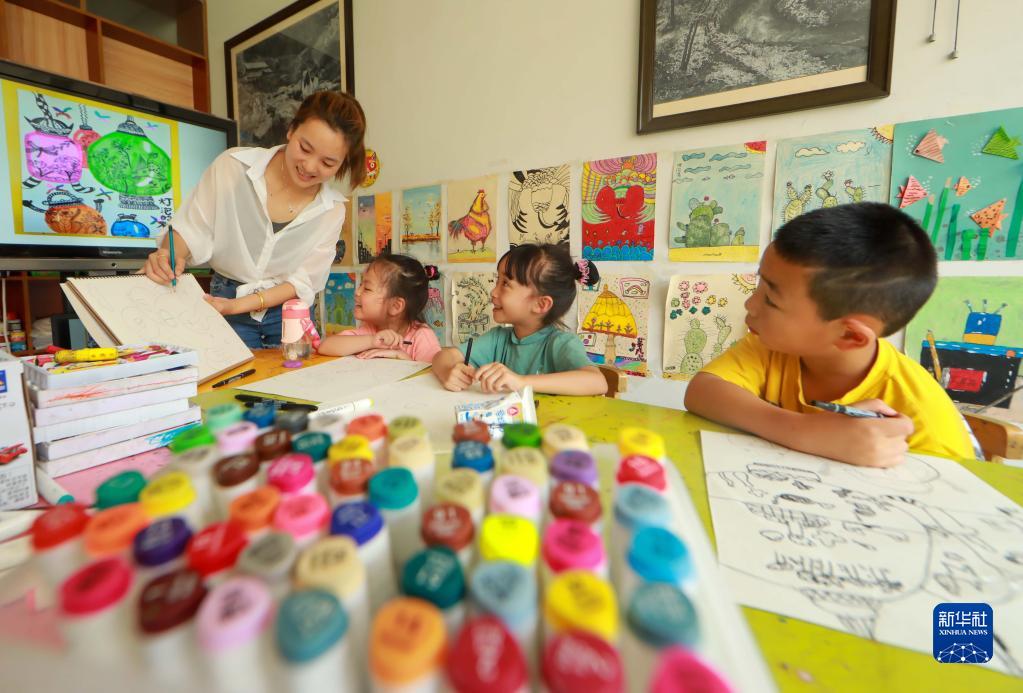 7月17日,學(xué)生在貴州省岑鞏縣一家美術(shù)培訓(xùn)學(xué)校學(xué)畫畫。