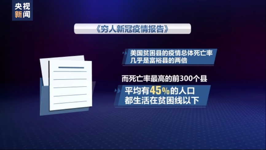 美國窮人權益組織與聯合國經濟學家合作編寫的一份《窮人新冠疫情報告》指出,美國貧困縣的疫情總體死亡率幾乎是富?h的兩倍,而死亡率最高的前300個縣,平均有45%的人口都生活在貧困線以下。還有調查顯示,疫情期間近20%的美國家庭花光了全部儲蓄,將近三分之二年收入低于50000美元的美國家庭難以支付房租、醫療和食品開銷,尤其是非洲裔和拉美裔家庭受沖擊最大。