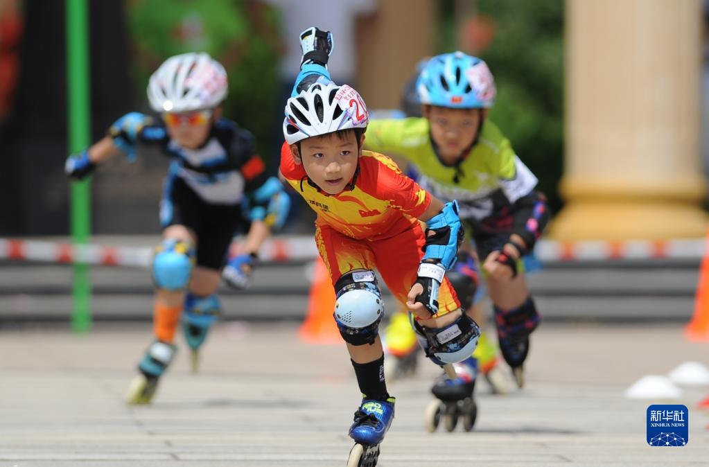 8月7日,小選手們在山東省棗莊市進行輪滑比賽。