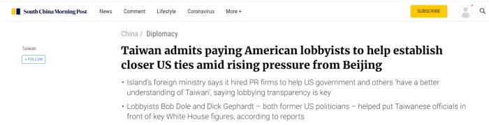 臺灣民進黨當局承認雇傭美國說客,與美方建立更緊密聯系。圖片來源:香港《南華早報》報道截圖