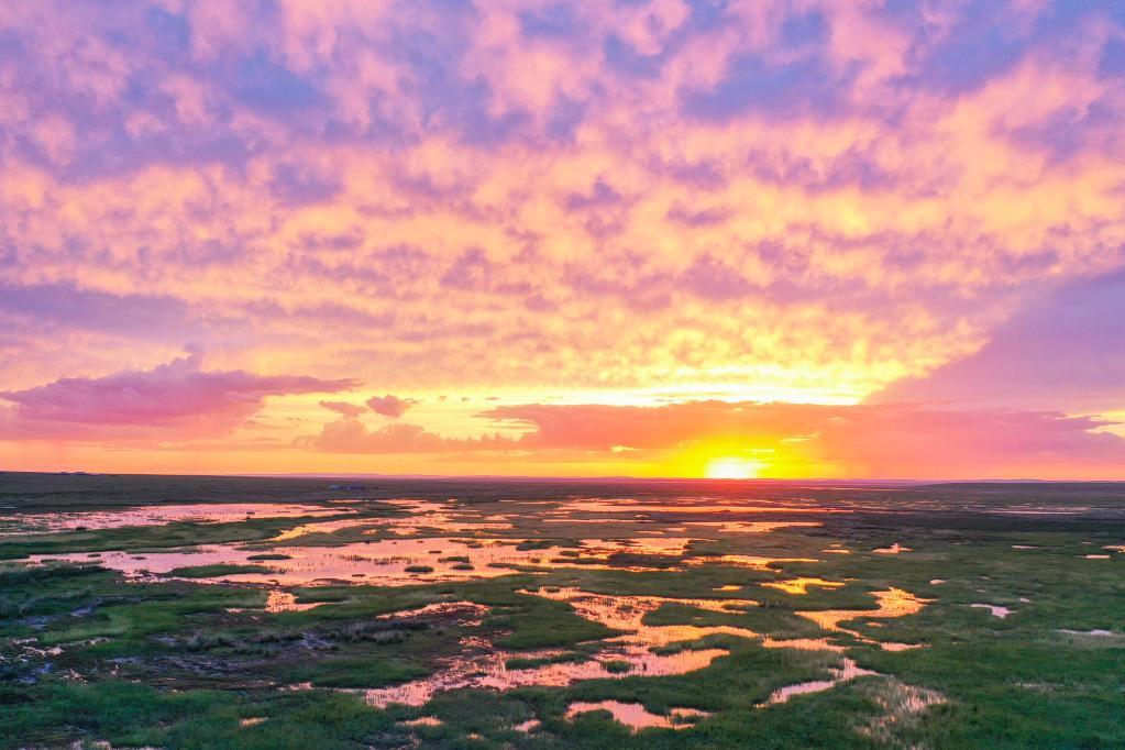 這是2022年7月27日在內(nèi)蒙古東烏珠穆沁旗拍攝的夕陽(yáng)下的草原(無(wú)人機(jī)照片)新華社記者 劉磊 攝