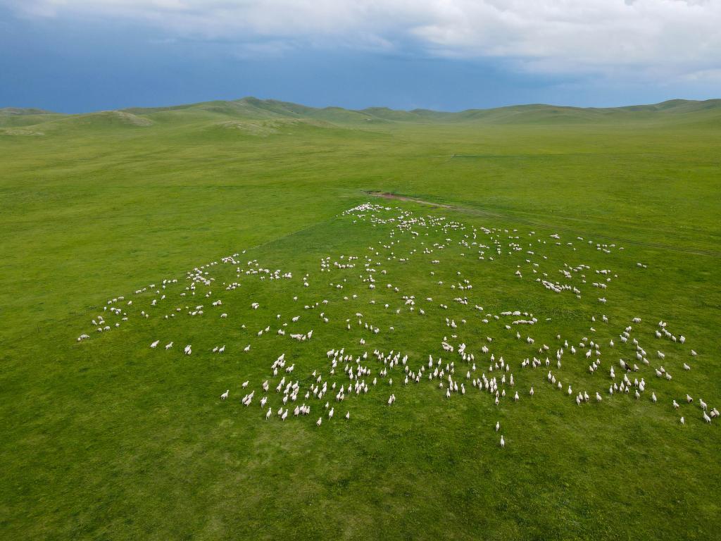 初秋的草原依然蔥郁,在內(nèi)蒙古自治區(qū)錫林郭勒盟東烏珠穆沁旗額吉淖爾鎮(zhèn),52歲的哈斯巴雅爾一大早就騎上摩托車,把羊群從棚圈緩緩趕到草場(chǎng)。羊兒停下腳步吃草,他便席地而坐,望向遠(yuǎn)方。“草的長(zhǎng)勢(shì)一年比一年好,綠得讓人心情舒暢。”他說(shuō)。