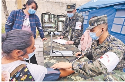9月7日,武警第二機(jī)動(dòng)總隊(duì)某支隊(duì)官兵為瀘定縣地震災(zāi)區(qū)群眾巡診。