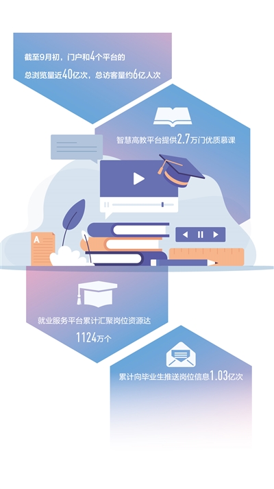 國家智慧教育平臺自上線以來,各類優質數字資源供給不斷擴大,瀏覽量持續增加。截至9月初,總瀏覽量近40億次,總訪客量約6億人次。這一集成了中小學教育、職業教育、高等教育和就業服務資源的國家教育公共服務平臺,正成為人們個性化自主學習、提升綜合素養、獲取就業信息的重要渠道,為促進教育公平和質量提升、縮小數字鴻溝提供有效支撐。