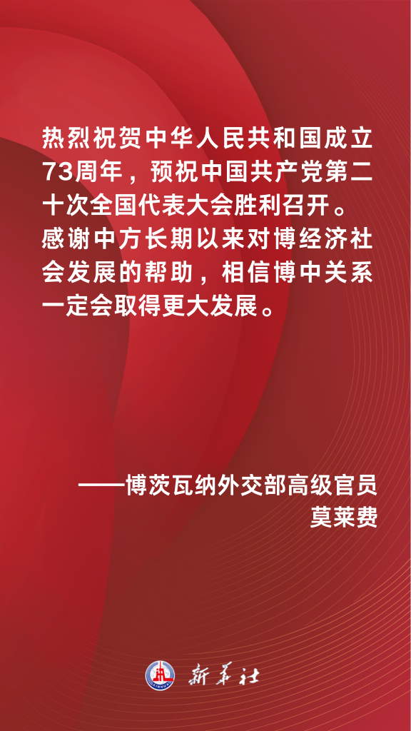 我駐外使領館、使團近日舉辦線下或云端國慶招待會等活動,慶祝中華人民共和國成立73周年,多個國際組織負責人、國家政要及各界人士出席活動或以其他方式發表致辭,對中華人民共和國成立73周年表示熱烈祝賀,預祝中國共產黨第二十次全國代表大會勝利召開,并期待與中國進一步深化各領域友好合作。