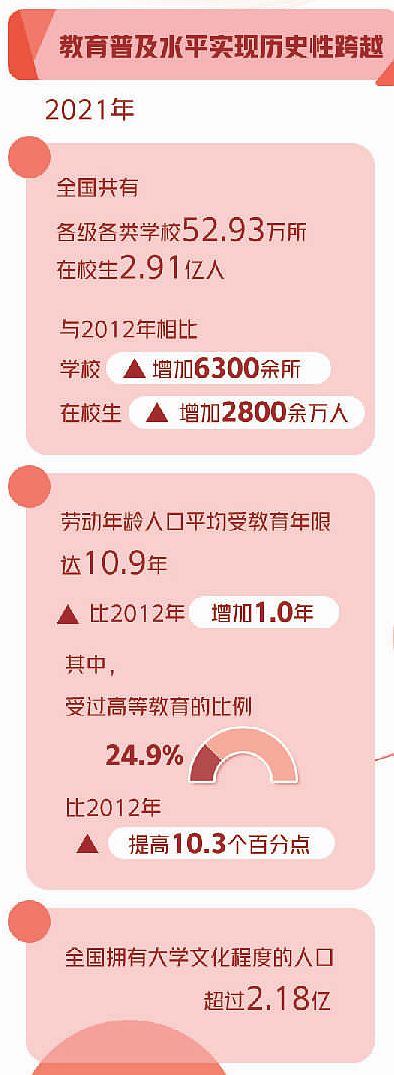 教育是國之大計、黨之大計。黨的十八大以來,在以習(xí)近平同志為核心的黨中央堅強領(lǐng)導(dǎo)下,我國教育事業(yè)取得歷史性成就。從教育部公布的一組數(shù)據(jù)可以明顯看出,10年來,我國教育普及水平不斷提高,國民受教育機(jī)會進(jìn)一步擴(kuò)大,受教育程度也得到了進(jìn)一步提升。2021年,勞動年齡人口平均受教育年限達(dá)10.9年,比2012年增加了1年。