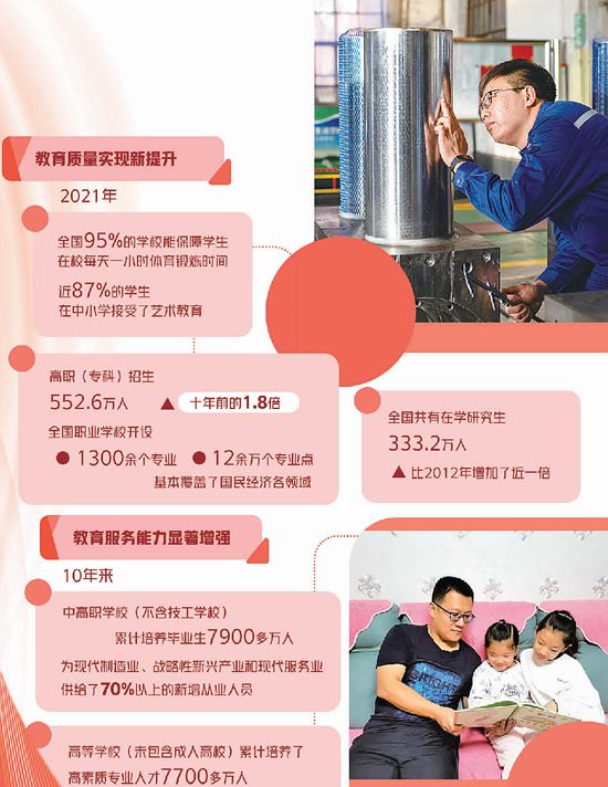 這10年,教育系統(tǒng)踐行以人民為中心的發(fā)展思想,教育發(fā)展成果更多更公平惠及全體人民。義務(wù)教育階段建檔立卡輟學(xué)學(xué)生實現(xiàn)動態(tài)清零;在義務(wù)教育全面普及的基礎(chǔ)上,全國2895個縣全部實現(xiàn)義務(wù)教育基本均衡;普惠性幼兒園更多了,2021年全國有普惠性幼兒園24.5萬所,占幼兒園總量的83%,其中有一半是公辦園;中西部和農(nóng)村地區(qū)孩子上好大學(xué)的機(jī)會更多了,國家支持中西部地區(qū)招生協(xié)作計劃得以實施,每年從全國招生計劃增量中專門安排部分名額面向中西部地區(qū)和考生大省招生;農(nóng)村孩子的個頭更高了,農(nóng)村義務(wù)教育學(xué)生營養(yǎng)改善計劃實施地區(qū)的男生、女生平均身高比2012年分別增高了4.2厘米和4.1厘米……