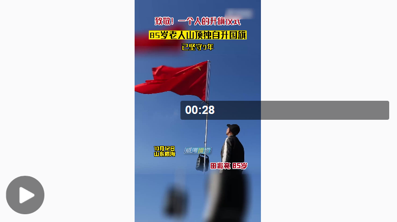 每天,山東威海85歲的田兆亮都會帶上國旗,前往村旁的小山舉行自己的升旗儀式。如今,村里幫老人焊制了旗桿、購買了音箱,見證升旗儀式的觀眾也越來越多。老人說:“每當國旗升起來,心情就特別激動,這就是我的家和國啊!”