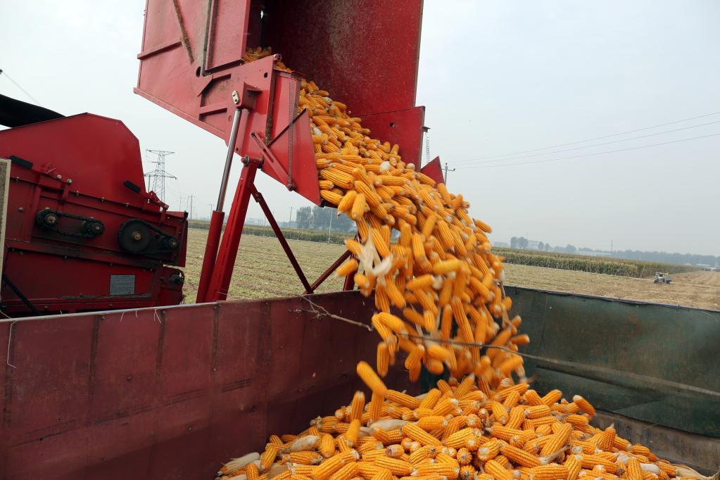 在河北省邢臺市南和區一處大豆玉米帶狀復合種植基地,農民將收獲的玉米裝車。(受訪者供圖)