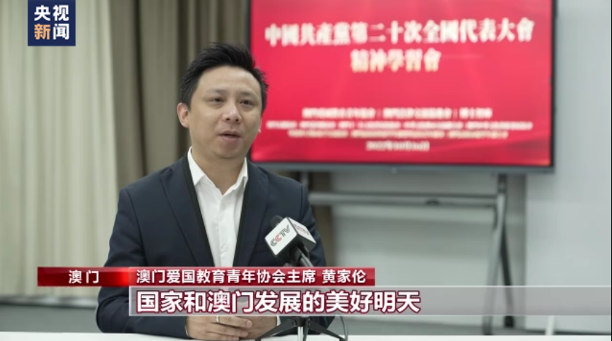 澳門愛國教育青年協(xié)會主席 黃家倫:聽了習近平總書記的報告后,大家的心情都特別激動,也非常受鼓舞。報告不僅展示了國家和澳門發(fā)展的美好明天,也將為港澳青年施展才華開辟更廣闊的天地。作為澳門青年,我覺得要立志民族復興,一方面要傳承好愛國愛澳的優(yōu)良傳統(tǒng),同時也要把個人成長和貢獻國家緊密聯(lián)系在一起。