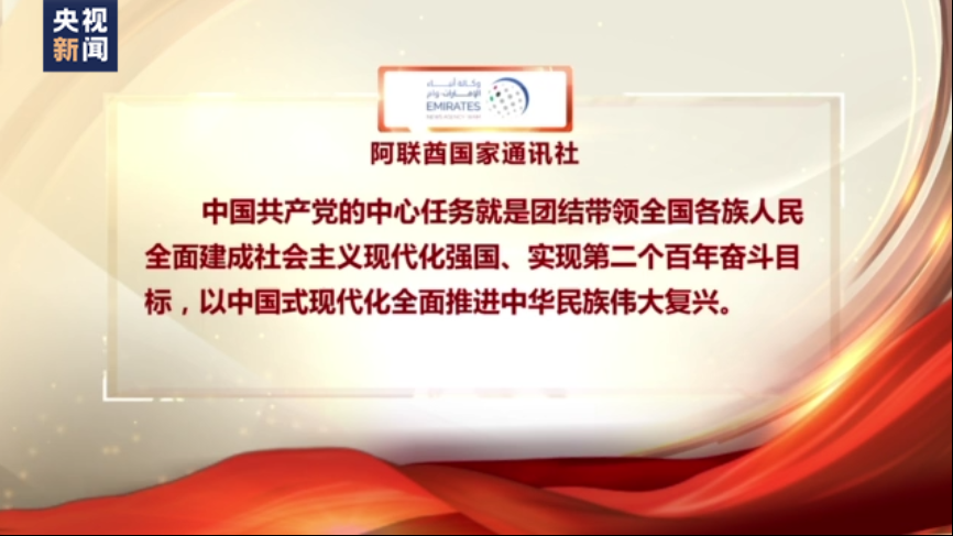 沙特《利雅得報》、 阿聯(lián)酋《聯(lián)邦報》、 阿聯(lián)酋國家通訊社等中東地區(qū)主要媒體刊發(fā)文章,援引二十大報告內容,其中,阿聯(lián)酋國家通訊社在報道中寫道,“中國共產黨的中心任務就是團結帶領全國各族人民全面建成社會主義現(xiàn)代化強國、實現(xiàn)第二個百年奮斗目標,以中國式現(xiàn)代化全面推進中華民族偉大復興。”