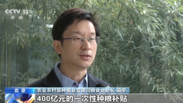 農業農村部種植業管理司糧食處處長 項宇:中央財政3次向實際種糧農民合計發放400億元一次性種糧補貼、比上年翻了一番。擴大了輪作資金規模補助大豆玉米帶狀復合種植,釋放了重農抓糧的強烈信號。