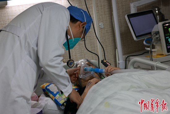 12月27日,北京朝陽醫院發熱門診留觀病房,呼吸與危重癥醫學科主任醫師賀航詠在與重癥患者溝通。