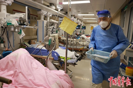 12月27日,記者在北京朝陽醫院急診科看到,診室已從3個增加至6個,專科病房“去專科化”,全部改為了綜合病房,過道里也排滿了臨時床位。急診科收治重癥患者的病房均由呼吸、重癥、急診的專家領軍,其他專科的大夫和護士支援,盡可能減少重癥病死率。“很多重癥病人慕名而來,我們也會盡最大努力收治。”朝陽醫院黨委委員、急診醫學科副主任梅雪說,“這不是平時的看病了,這像是打一場仗。”