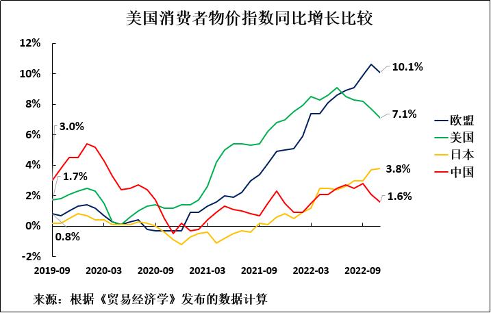 相反,如圖4所示,在疫情期間,中國通脹率并沒有上漲,反而仍低于疫情開始時的水平。可以看出,疫情爆發前,中國通脹率為3.0%,高于美國(1.7%)或歐盟(0.8%)。但是,根據最新數據,2022年11月,美國通脹率飆升至7.1%,歐盟通脹率則飆升至10.1%——兩者通脹率均為40年來最高水平。日本通脹率(3.8%)遠低于美國或歐盟,但仍明顯高于中國。