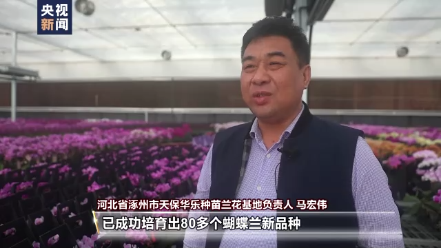 河北省涿州市天保華樂種苗蘭花基地負責人 馬宏偉:我們的種苗基地已成功培育出80多個蝴蝶蘭新品種,年出口種苗達到6000萬株,銷售成品蝴蝶蘭20余萬株,年產值超千萬元。