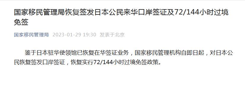 國(guó)家移民管理局恢復(fù)簽發(fā)日本公民來(lái)華口岸簽證及72/144小時(shí)過(guò)境免簽